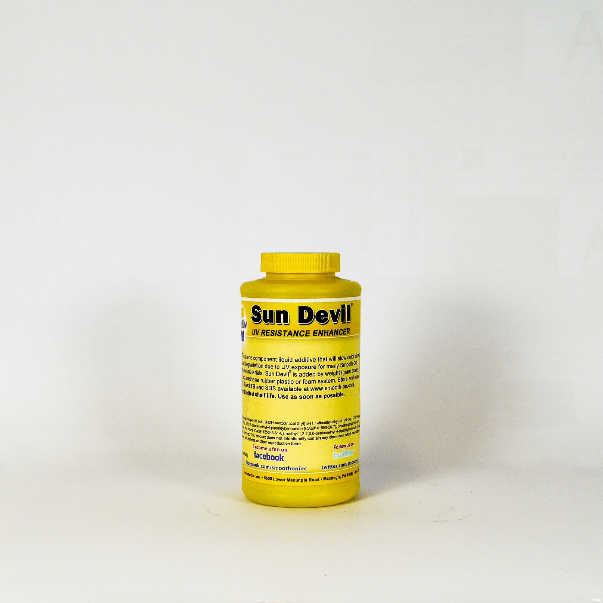 Eine dauerhafte UV-Stabilität ist bei flüssigen Urethanprodukten nicht möglich. Letztlich besteht die einzige Möglichkeit darin, die abbauenden Auswirkungen (Farbveränderung und Oberflächenabbau) von UV-Licht auf diese Materialien zu verzögern. Sun Devil™ ist ein flüssiges Einkomponenten-Additiv, das die Farbveränderung und den physikalischen Abbau durch UV-Bestrahlung bei vielen Smooth-On Flüssigurethanprodukten verlangsamt. Sun Devil™ wird dem Urethan-Gummi, -Kunststoff oder -Schaumstoffsystem nach Gewicht zugegeben (Grammwaage erforderlich). Die Ergebnisse sind unterschiedlich und hängen von der Intensität und Dauer der UV-Bestrahlung des ausgehärteten Materials ab.
