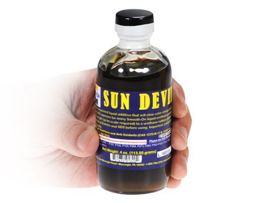 Eine dauerhafte UV-Stabilität ist bei flüssigen Urethanprodukten nicht möglich. Letztlich besteht die einzige Möglichkeit darin, die abbauenden Auswirkungen (Farbveränderung und Oberflächenabbau) von UV-Licht auf diese Materialien zu verzögern. Sun Devil™ ist ein flüssiges Einkomponenten-Additiv, das die Farbveränderung und den physikalischen Abbau durch UV-Bestrahlung bei vielen Smooth-On Flüssigurethanprodukten verlangsamt. Sun Devil™ wird dem Urethan-Gummi, -Kunststoff oder -Schaumstoffsystem nach Gewicht zugegeben (Grammwaage erforderlich). Die Ergebnisse sind unterschiedlich und hängen von der Intensität und Dauer der UV-Bestrahlung des ausgehärteten Materials ab.