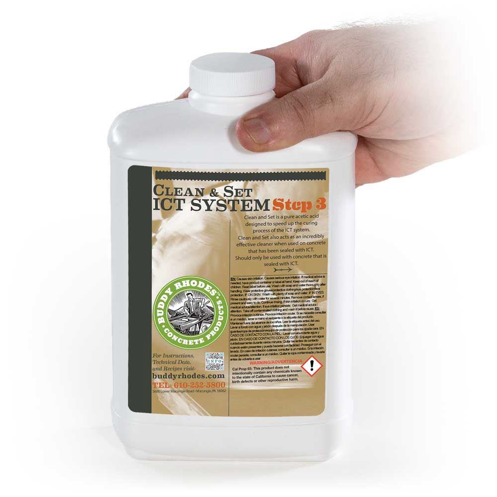 Clean & Set ist der dritte und letzte Schritt des ICT-Versiegelungssystems. Er beschleunigt die Aushärtung der FS Seals-Versiegelung. Darüber hinaus ist es ein wirksames Mittel zur Reinigung der mit ICT behandelten Oberflächen. Clean & Set basiert auf Essigsäure und ist mit drei Teilen Wasser zu mischen.