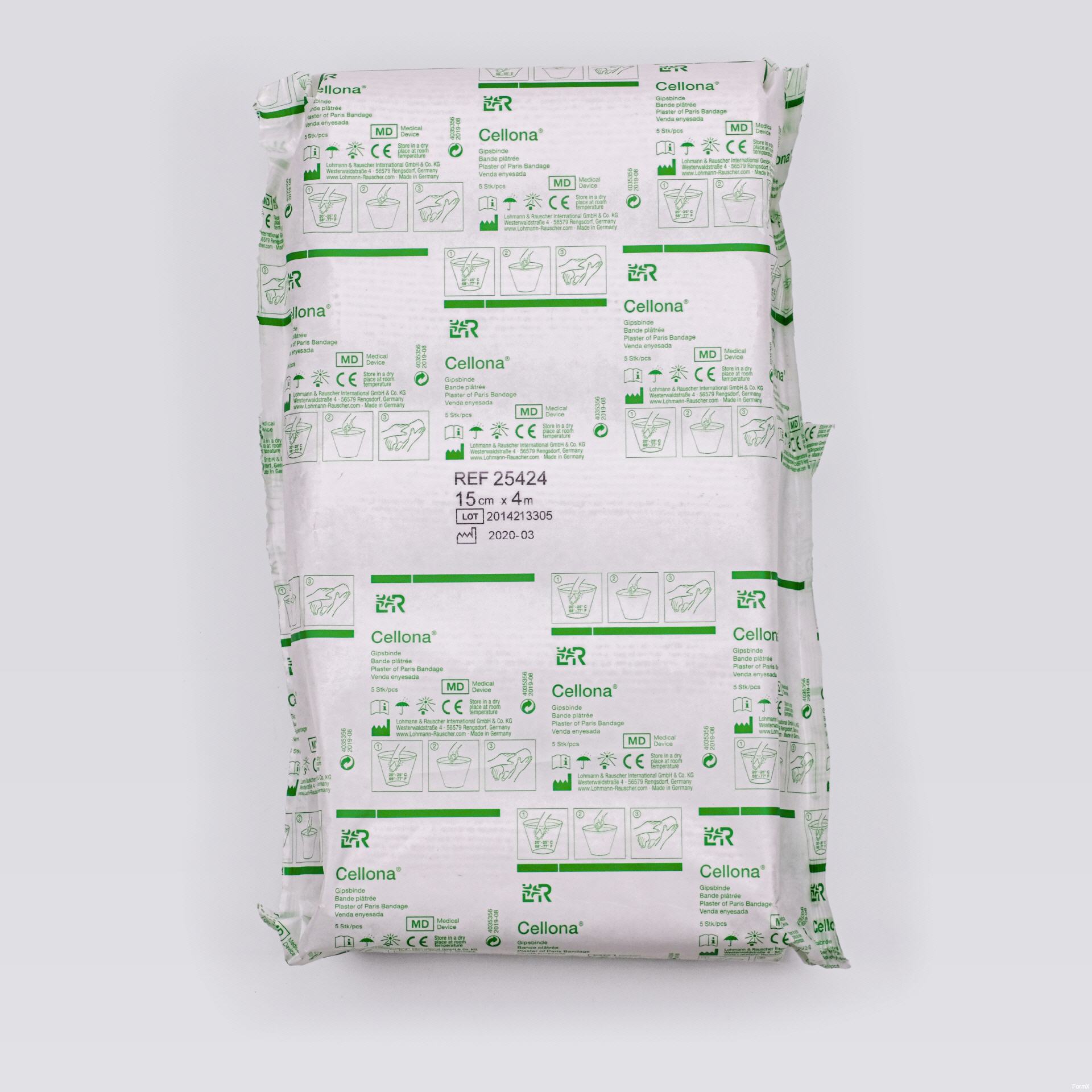Cellona Gips Bandage 15cmx4m / Verpackungseinheit 5 Rollen, 15 cm breit bei einer Länge von 4 Metern. Ca. 3,5 Minuten Verarbeitungszeit.