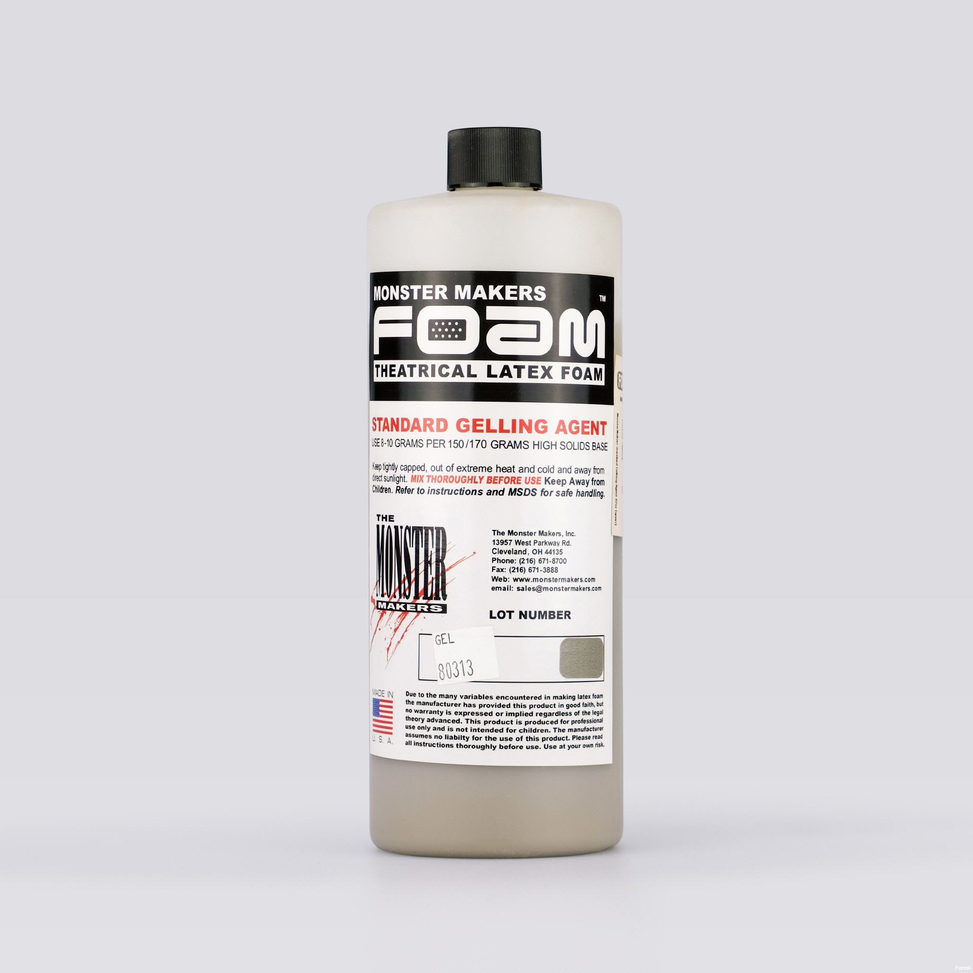 Dies ist unser Standardgeliermittel, das in jedem MOnster Makers Foam Latex Kit enthalten ist. Das Geliermittel wirkt als ein Koagulationsmittel mit verzögerter Wirkung, was bewirkt, dass sich der flüssige Schaum in eine halbfeste Masse verwandelt. Afhankelijk van een aantal factoren, waaronder hoe ammoniak aanwezig is in het schuim op het tijdstip van toevoeging, zal de gelling begin met een chemische overgang the het mogelijk maakt om de schuim te veranderen staten in een vertraagde manier.