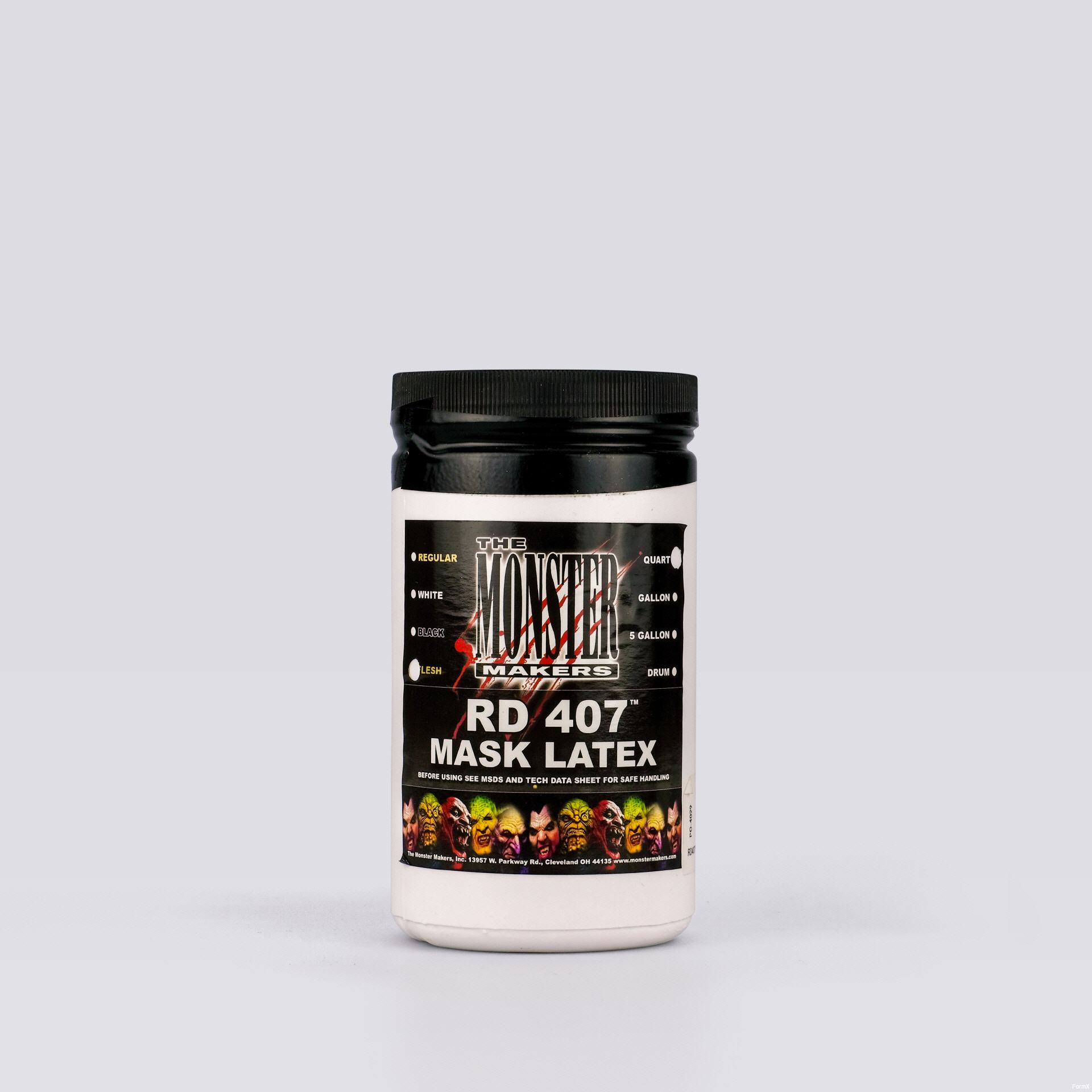 RD-407(™) is the highest quality casting latex available for mask making, prop making, and slush molded prosthetics. Formulated specifically for casting into gypsum molds, RD-407(™) Mask Making Latex is a single component, air drying natural latex compound used widely by mask makers around the globe. Popular among many special effects artists, RD-407(™) can be brushed or poured into gypsum molds. It features a quick skin build-up, excellent detail reproduction and a fast demold. RD-407(™) can be painted with adhesive based paints or Monster Makers Mask Paints. RD-407(™) comes as a naturally viscous material that yields a stretchy but durable rubber upon curing. While other companies sell products that they call RD-407, this is the official trademarked RD-407(™) formulation originally sold by R&D Latex Company in Commerce, California: a recipe that is now well over 50 years old!