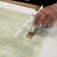 Polyester Glasmatte ist das Standard Material beim Arbeiten mit Polyester. Erhältlich in verschiedenen Stärken, ausgedrückt in Gramm pro m². Je schwerer das Gewebe, desto dicker und stärker werden die Lagen. Bauen Sie mindestens 3 Lagen aus überlappenden Stücken auf. Wenn Stärke keine Priorität hat, können zur schnellen und einfachen Verarbeitung geschnittene Bündel, gesättigt mit Harz verwendet werden. Diese mit einem Pinsel anbringen.