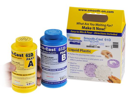 The Smooth-Cast™ Semi-Rigid line of low-cost semi-rigid urethane casting resins cure quickly to semi-rigid plastics that offer exceptional strength and impact resistance. New Formulations – New Look! Smooth-Cast™ 61D is newly reformulated with a translucent white appearance and improved physical properties. All Smooth-Cast semi rigids are now mercury free and phthalate free. These plastics are easy-to-use (mix ratio is 1A:1B by volume) and have low viscosities for minimal bubble entrapment. Vibrant colors are possible by adding SO-Strong™, UVO™ or Ignite™ colorants.