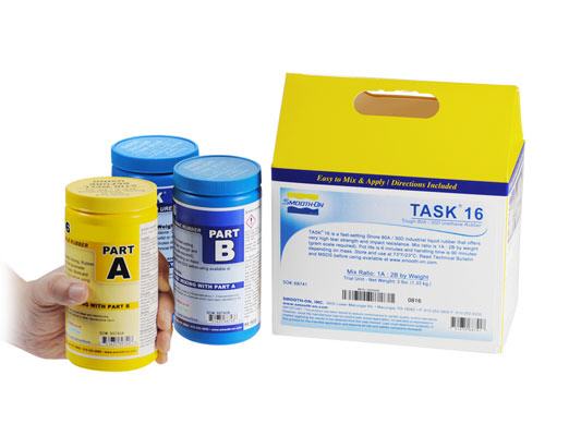 ASK®16 ist geruchsarm, schnell härtend mit eine Shore von 80A / 30D Urethan, es bietet Reißfestigkeit und Schlagfestigkeit. TASK®16 ist Phthalaten, MOCA und quecksilberfrei. Gehärtete Kautschuk hat außergewöhnliche Leistungsmerkmale und Dimensionsstabilität. TASK® 16 kann mit SOStrong® oder Ignite® Pigmente gefärbt werden. TASK®16 ist geeignet für die Herstellung von schnellen mechanischen Teile, Dichtungen, Räder und Rollen, schlag zähe Requisiten und die Archivierung von Meistermodelle. Es wird genutzt für verschleißfeste Kautschukformen für Beton. TASK®16 ist sehr geeignet für Rotocasting und die Entwicklung halbstarren Gußteile.