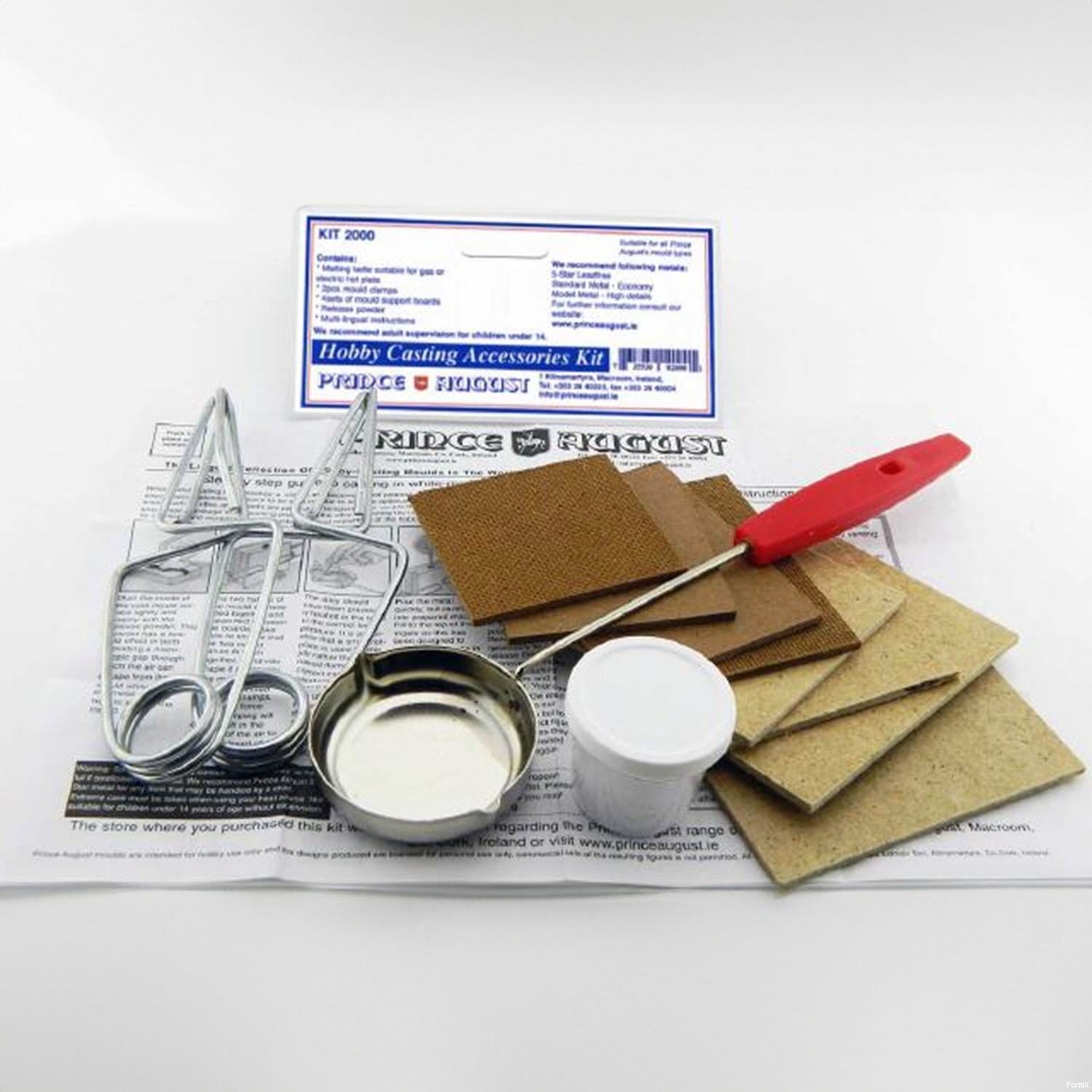Inhalt: Gießpfanne, kleiner Topf mit Trennpulver, 3 Sätze unterschiedlich große Trägerplatten (für jede Form geeignet), 2 Formklammern, Gießanleitung.