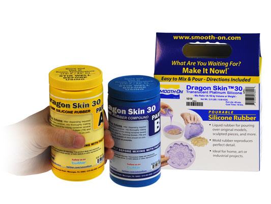 Ein additionsvernetzendes Hochleistungs-Platin Silikonkautschuk. Es ist vielseitig und einfach zu verarbeiten. Mischungsverhältnis beträgt 1A: 1B nach Gewicht oder Volumen, Topfzeit beträgt 45 Minuten, Aushärtungszeit ist 16 Stunden bei Raumtemperatur. Das Silikon härtet bei vernachlässigbarer Schrumpfung mit einer Shore-Härte von 30A, weißlich transluzent. Eine Entlüftung nach dem Mischen mit Vukuumpumpe wird empfohlen. Dragon Skin ® 30 ist kompatibel mit anderen Dragon Skin ® Silikonkautschuk und ist für viele Special- und Make-up FX Anwendungen und Prothesen geeignet. Dragon Skin ® 30 ist auch zur Herstellung von Formen oder Konfiguration für das Gießen von Gips und Beton, Wachs, bei niedrigen Temperaturen Metall-Legierungen , Harze und andere Platinum Silicone (Trennmittel erforderlich) geeignet. Alle Silikonen dieser Serie sind weißlich transluzent und können deshalb gut mit Silc-Pig Pigmentfarben (z.B. Flesh-Tone Hautfarbe) eingefärbt und mit Psycho-Paint en Siltone oder FuseFX bemalt werden. Dieses Silikon wird verdickt mit Thi-Vex ® oder mit Silikon Thinner ® vergedünnt.