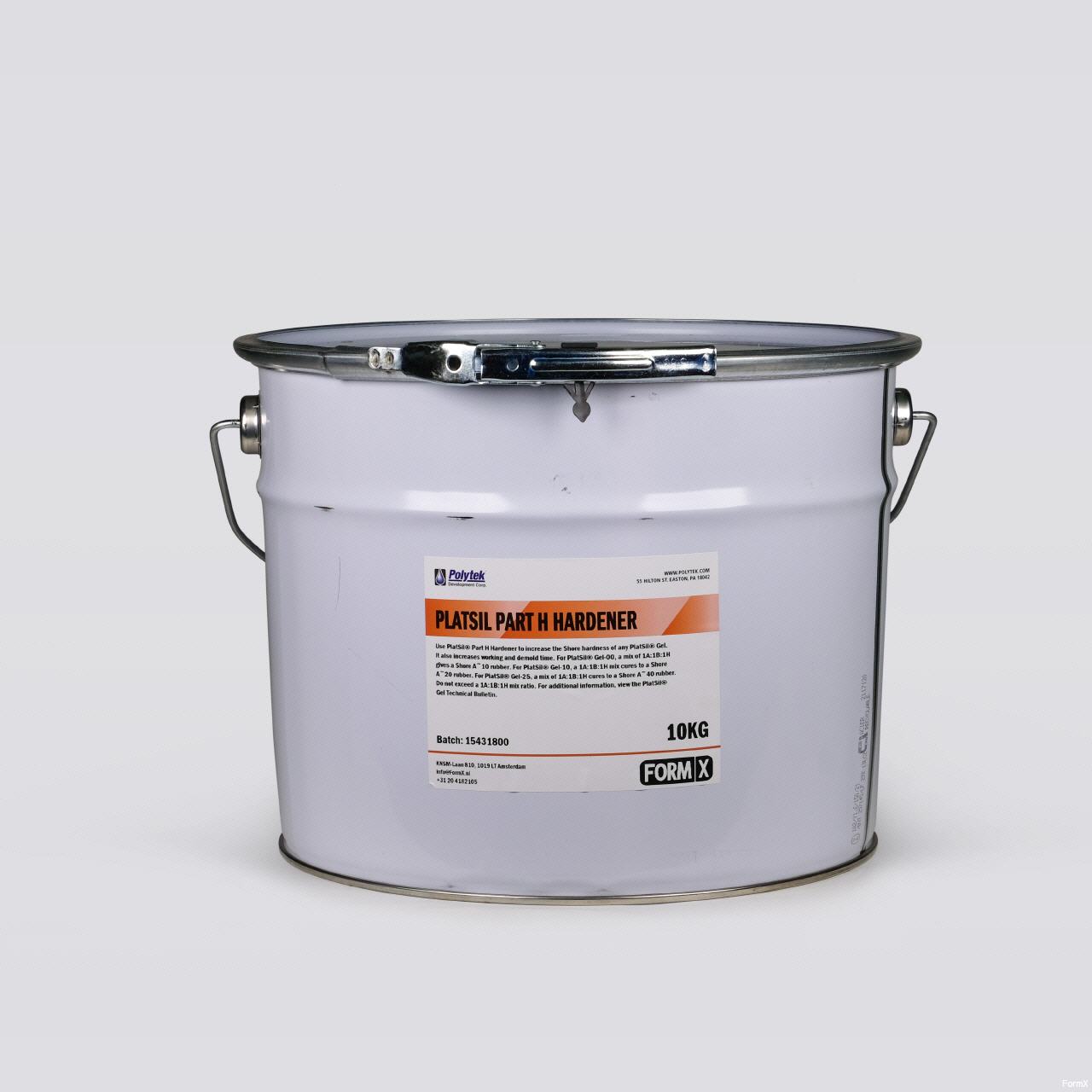Platsil Part H Hardener can be used to increase the Shore Hardness of any of the Platsil Gels. It also increases working and demold time. For Gel 00, a mix of 1A:1B:1H gives a Shore A10 rubber. For Gel 10, a mix of 1A:1B:1H cures to a Shore A20 rubber. For Gel 25, a mix of 1A:1B:1H has a 7 minute working time and cures to a Shore A40 rubber in under 2 hours.