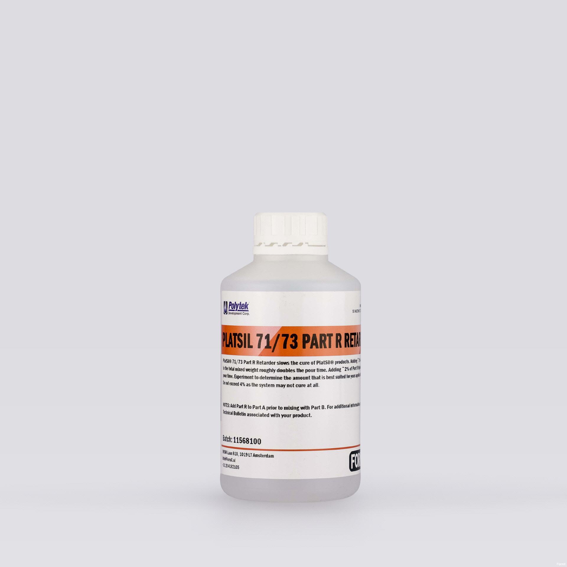 PlatSil Retarder 71 & 73 R can be used with all Platinum based silicone liquid rubbers to slow the cure and yield a longer working time. Adding ~1% (to the Part A first) of part R to the total A B mixed weight roughly doubles the working time. Adding ~2% roughly triples the working time. Do not exceed 3%.