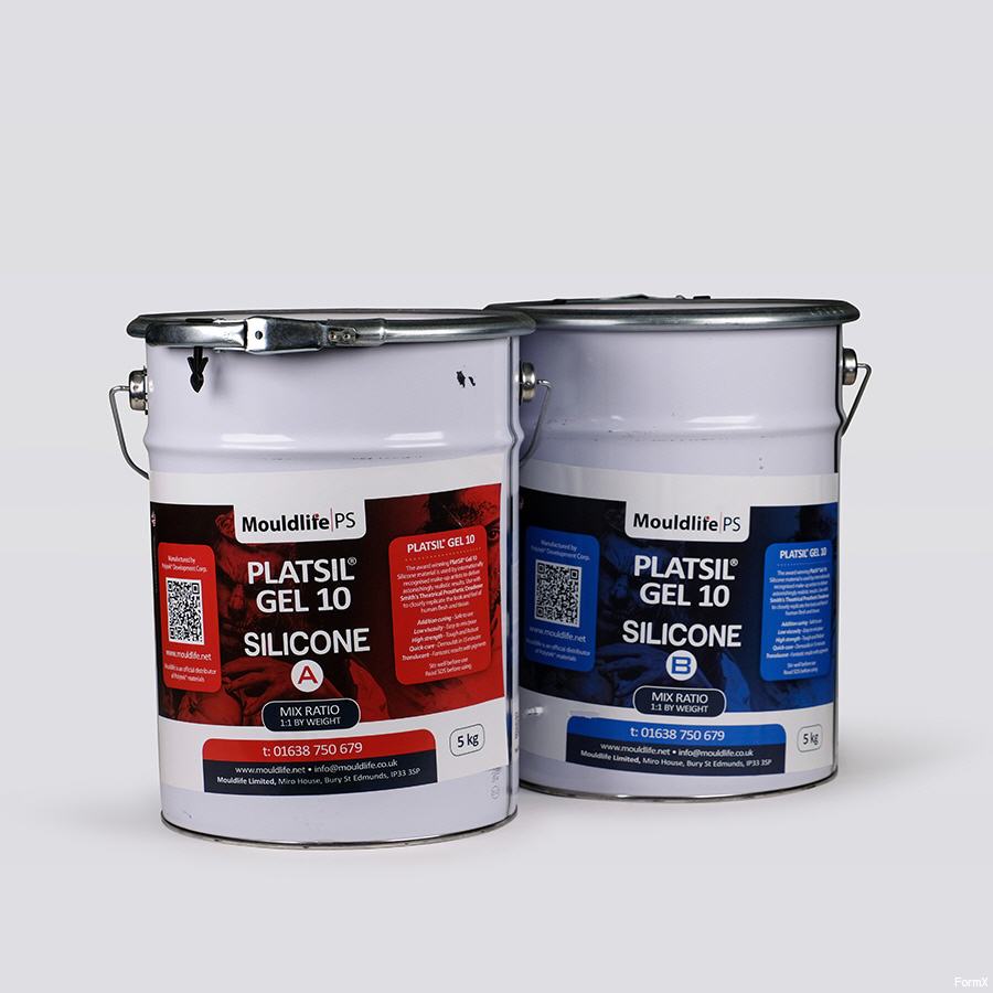 1A:1B (by weight or volume) platinum-cured silicone systems with 6-minute working and 30-minute demold time. PlatSil Gel10 cures to a Shore A10 hardness, But remember to create prosthetic parts you need to add the Smiths deadener to achieve the gel status.