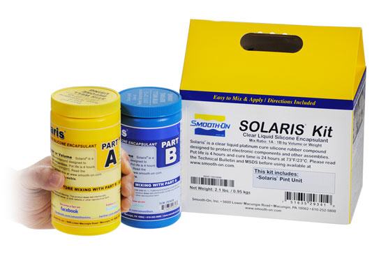 Solaris ™ ist eine klares und farbloses Platinadditions Silikonkautschuk mit niedriger Viskosität, zum Schutz von elektronischen Bauelementen und anderen Baugruppen konzipiert (um gegen Stöße zu schützen, Vibration, Feuchtigkeit, Ozon, Staub, Chemikalien und anderen Umweltgefahren, durch Eingießen oder Einkapselung der Bauteile und Assemblies).