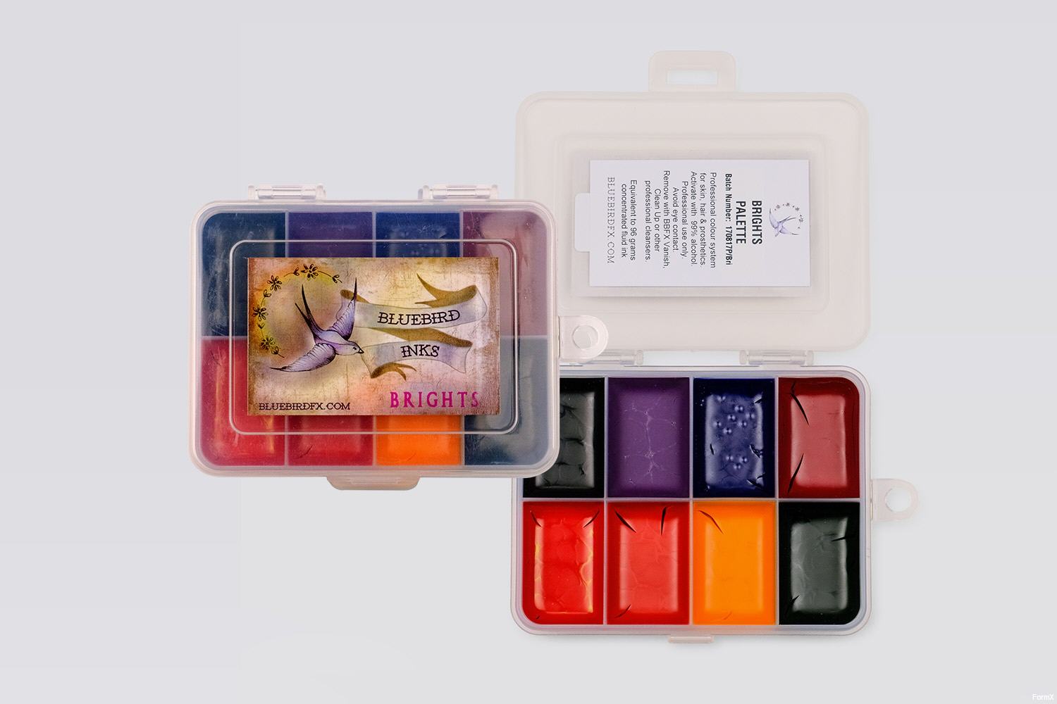 Ursprünglich für die Körperbemalung gedacht, ist diese Palette inzwischen zum Standard für jeden Künstler geworden, der gerne die Kontrolle über das Mischen seiner eigenen Farben hat. Die Farben: (Fuchsia, Spinat, Kobalt, Sonnenblume, Iris, Ringelblume, Schwarz, Scharlach) Die Bluebird Ink Paletten sind cremig und haben eine üppige, satte Farbe. Sie haben eine erstaunliche Deckkraft und Konsistenz. Die Bluebird Ink Paletten eignen sich perfekt zum Abdecken von Tattoos und zum Erzeugen von Effekten wie Narben und Blutergüssen.