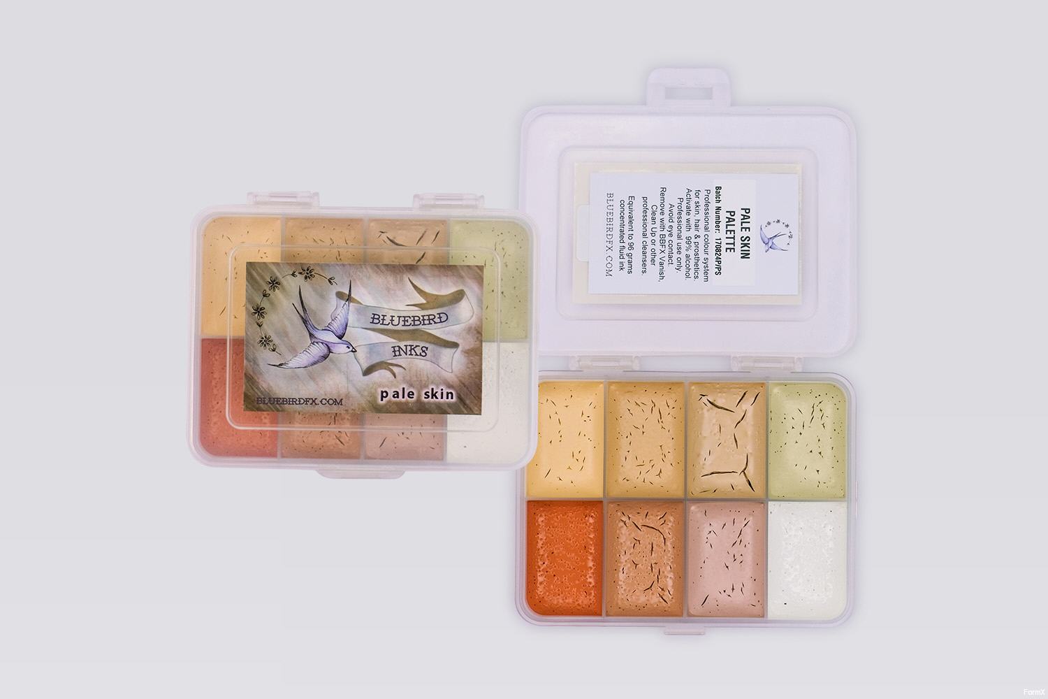 Die Bluebird Ink Paletten eignen sich perfekt zum Abdecken von Tattoos und zum Erstellen von Effekten wie Narben und Prellungen.