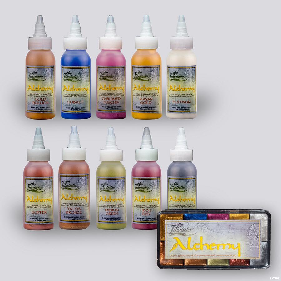Die Skin Illustrator Alchemy Palette ist die vierte Ergänzung zur Produktlinie von Skin Illustrator. Als erste in einer Serie von Spezialfarben wurde diese Palette mit lebhaften Metallic-Farben entworfen, um wertvolle flüssige Metalle zu simulieren. Die Farben sind sicher für die Anwendung auf den Lippen, der Haut, den Haaren und rund um die Augen. Die Farben können mit PAX, Gummimaske-Fett, Schaumlatex, Gelatine, Kunststoff und Silikonapplikationen verwendet werden. Die ALCHEMY PALETTE und Flüssigkeiten eignen sich ideal für Beauty-, Fantasy- und Spezialeffekt-Make-up. Alle Skin Illustrator Alchemy-Farben sind auch als Flüssigkeiten für das Airbrushen erhältlich.