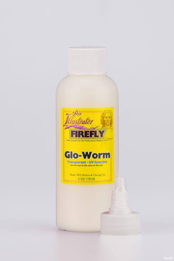 Glo-Worm ist eine neue transparente UV-reaktive Illustratorfarbe, die unter UV-Licht leuchtet. Es kann über jede Haut-Illustrator-Farbe oder jede Farbe auf Wasserbasis gemalt werden. Es ist sicher für die Anwendung im Gesicht. Perfekt für Halloween-Treffpunkte, Avantgarde-Make-ups und Cosplay. FX-Pigment für Reveal-Effekte.
