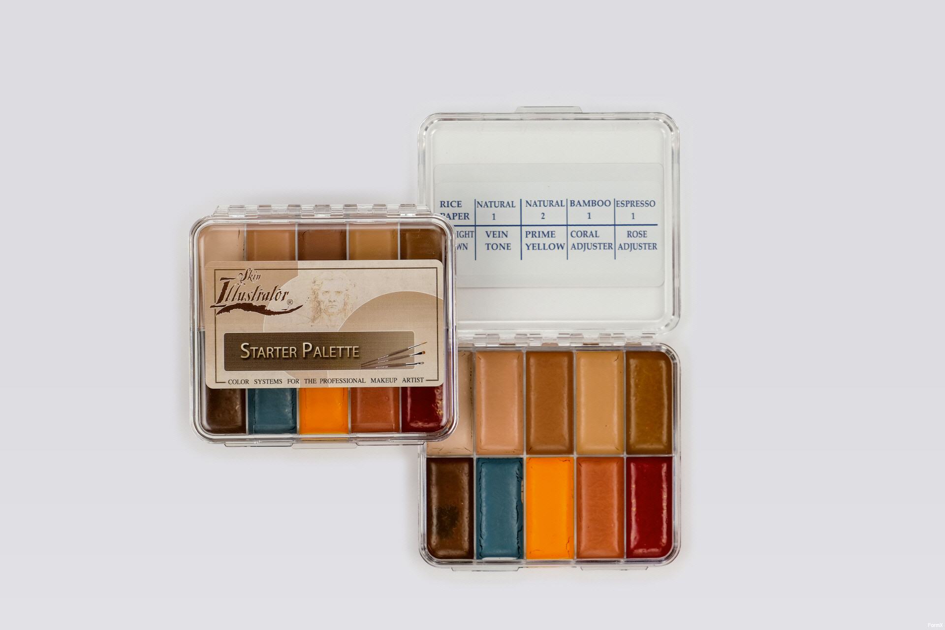 The Skin Illustrator Starter Palette is an excellent way to begin using the alcohol-based colors. This palette contains twelve of our most common colors from the Flesh Tone, Dark Flesh tone, FX and Complexion palettes. This compact palette is a time saver on set, it fits easily in your pocket and it is great for students and beginners, as it is less expensive then a standard size Skin Illustrator Palette. The colors can easily be applied with a brush or mascara wand (palette cells may be too small to apply color with a sponge). Use it alone, or mix the colors with any of the other Skin Illustrator tones to create your own unique blend of color. You must use Skin Illustrator Activator, Skin Illustrator Slow Activator, or 99% alcohol to activate the color pigment. Do Not use 70% alcohol, MEK, acetone, water or any other solvent. Removal is easy with PPI's Telesis Super Solv or Telesis Makeup Remover.