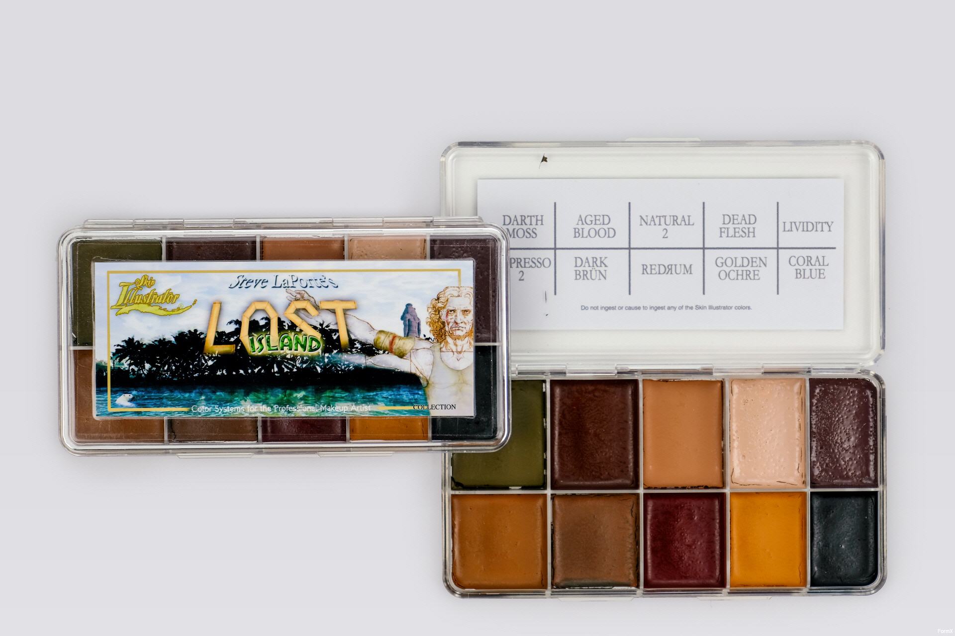 Entworfen von Steve La Porte für die Schauspieler in der Hit-Serie "Lost". Diese Palette enthält alle Farben, die Sie brauchen, um "gestrandet auf einer einsamen Insel" zu gestalten, inclusief Schmutz und FX Farben, die für jedeS Charakter Make-up verwendet werden können.