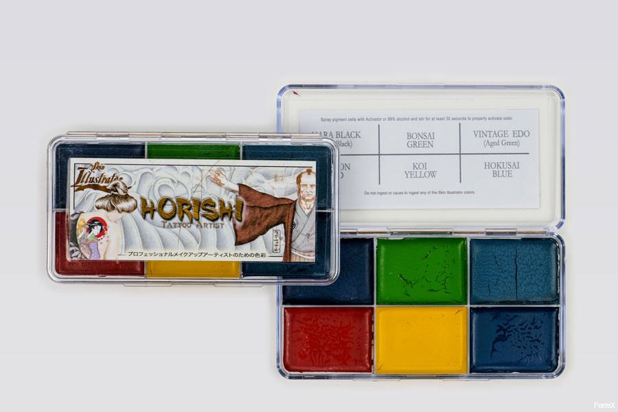 The Skin Illustrator Horishi Palette ist zusammen gestelt, um jede Art von Tattoo machen, von Vintage Matrozen Tattoo bis zu trendigen Tribals und alles dazwischen. Speziell für die traditionelle japanische Tattoos ist diese Palette ein must-have Ergänzung zu Ihrem in de Special Make-up Kit.