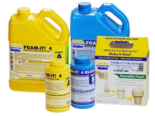 Smooth-On’s FOAM-iT!™ Series are two-component water blown rigid foams that are versatile and easy to use. FOAM-iT!™ products are available in 3lb., 4 lb., 5 lb., 8 lb., 10 lb.,15 lb. or 26 lb. per cubic foot densities. Parts A and B are measured and mixed in equal amounts by volume. The mixture is then poured into a mold or other form (apply release agent if necessary). The mixture will expand many times original volume (depending on which FOAM-iT!™ product you are using) and develop a uniform cell structure. FOAM-iT!™ 4 Black is pre-pigmented to a very deep black color. All FOAM-iT!™ products can be used as a straight casting material, backfill material for hollow castings (adds structural strength) or as an encapsulation material, etc. They can be color pigmented with SO-Strong™, UVO™ or IGNITE™ colorants and are used for a variety of art/ craft, industrial design and special effects applications