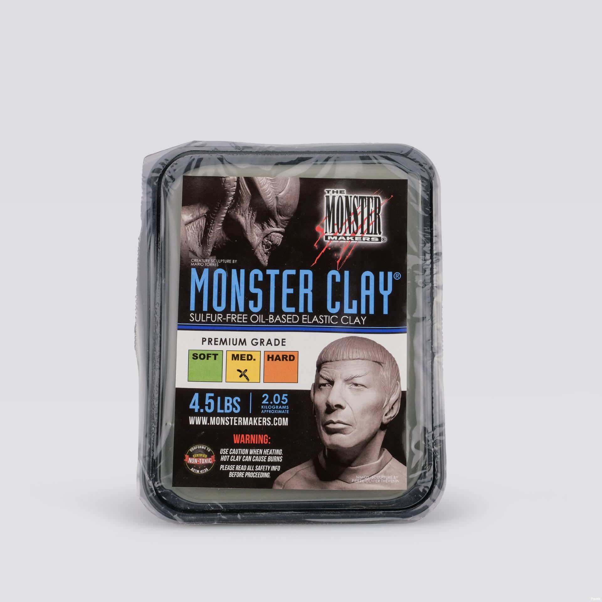 Monster Clay® Gray Premium Grade Modeling Clay is a re-useable sulfur free, professional oil/wax based sculpting medium. Composed entirely of non-toxic, food grade components, Monster Clay® Gray has an ultra smooth formulation that features a low melt temperature and a low tack feel that will not stick to tools or fingers. Monster Clay® Gray has high plasticity and has a unique elastic quality much like soft taffy when warm. At average room temperature, Monster Clay® Gray is firm enough to capture even the finest details and can be re-used and re-melted indefinitely. Monster Clay® melts easily to a pourable consistency and is great for making copies of life casts where changes are needed. This sulfur free recipe is compatible with platinum silicone molding compounds. Buy it once and re-use it over and over again. Each five pound quantity of Monster Clay® Premium is individually packaged in a convenient, reusable oven-safe container. Best of all, Monster Clay® has lower density than the average oil based clay medium. This means that you receive approximately 25% more clay per pound without the added cost.