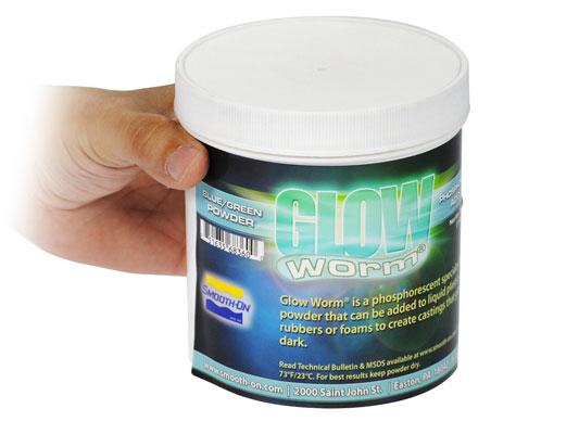 Glow Worm™ phosphoreszierende Pulver können flüssigen Kunststoffen, Gummis und Schäumen von Smooth-On zugesetzt werden, um Gussteile herzustellen, die im Dunkeln leuchten, nachdem sie mit Licht aufgeladen wurden.