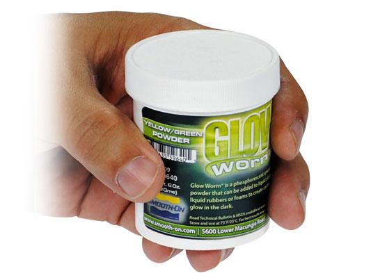 Glow Worm™ phosphoreszierende Pulver können flüssigen Kunststoffen, Gummis und Schäumen von Smooth-On zugesetzt werden, um Gussteile herzustellen, die im Dunkeln leuchten, nachdem sie mit Licht aufgeladen wurden.