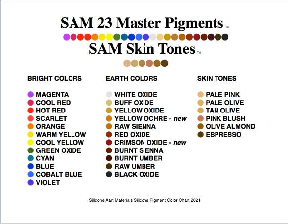 Mixing Info: SAM Silicone Colors have been formulated so 1% by weight (1 part color to 100 parts silicone -or- 1 small squirt to 1/2 cup silicone by volume) will give a good representation of that color in translucent silicone. For full color saturation use up to 5%, although 3% will probably be all you will ever need. Use 0.5% or less for translucent effects. For painting use up to 5% mixed into translucent silicone rubber, paint base or adhesive / caulking for general coloration, up to to 10% for intense opaque detail. Thin to proper consistency with appropriate solvent.