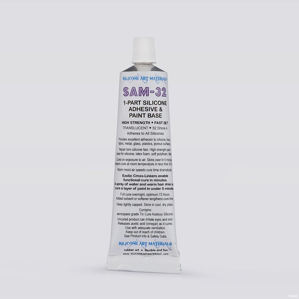 Exotic cross-linkers enable functional cure in minutes. 1 Part. No catalyst to weigh out. Squeeze out of tube and SAM-32 air quickly cures to a rubber. Rapid build up of strength helps get damaged silicone repaired and back into service fast. Silicone animatronics, robots, dolls, artificial limbs, masks, molds. Superb paint base for all silicones, latex foam, soft poly foam, canvas, fabric. Color with SAM Silicone Pigments. Silicone Paint = Silicone Pigment + Silicone. Rubbery 32 Shore A.