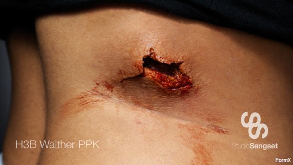 H3A Walther PPK mit 7.65mm Munition. Abgewinkelte Eintrittswunde aus nächster Nähe.