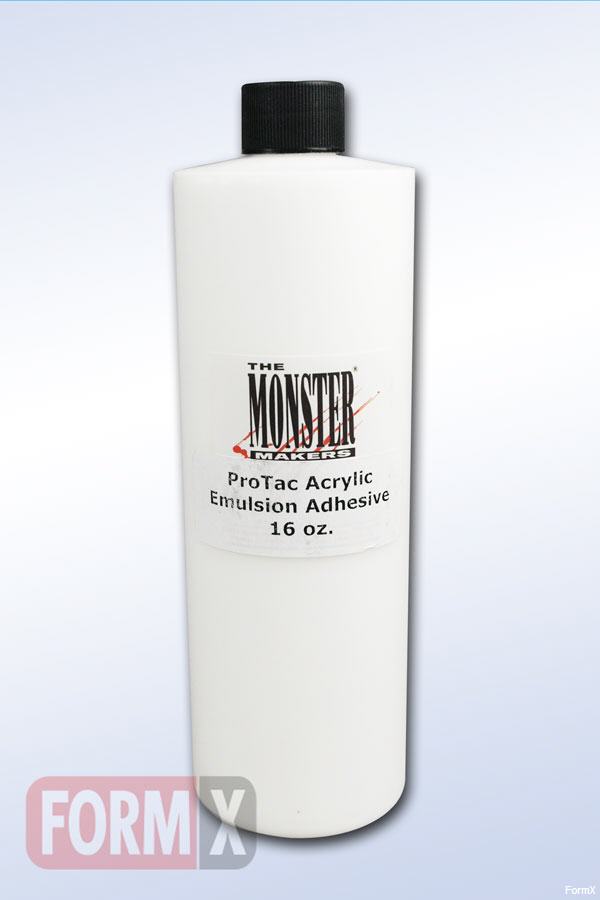Monster Makers Brand exclusive acrylic adhesive used to adhere many types of prosthetic appliances. Pro-Tac will work for latex, foam latex and gelatinprosthetics. Creates a strong adhesion to skin so appliances will stay on for many hours. One of the most popular makeup adhesives on the market. Use our Isopropyl Myristate for removal. Bottle 480 ml.