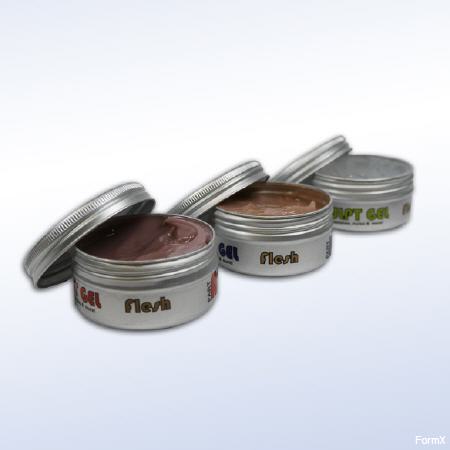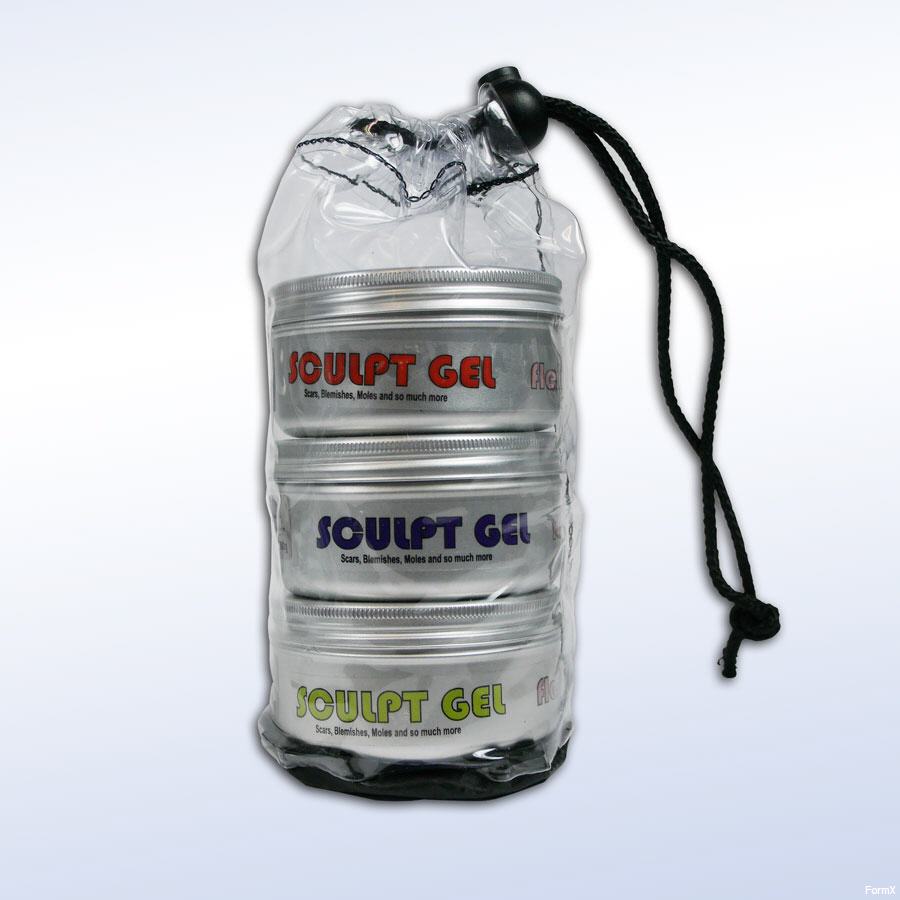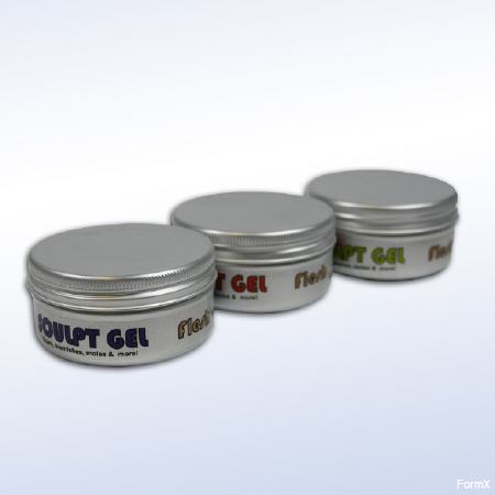Scupltgel wird mit einem dritten Teil geliefert, der das Material zu einem Gel erweicht, für jene Narben am Hals, bei denen Sie diese Dehnung für ein lebensechtes Aussehen benötigen.